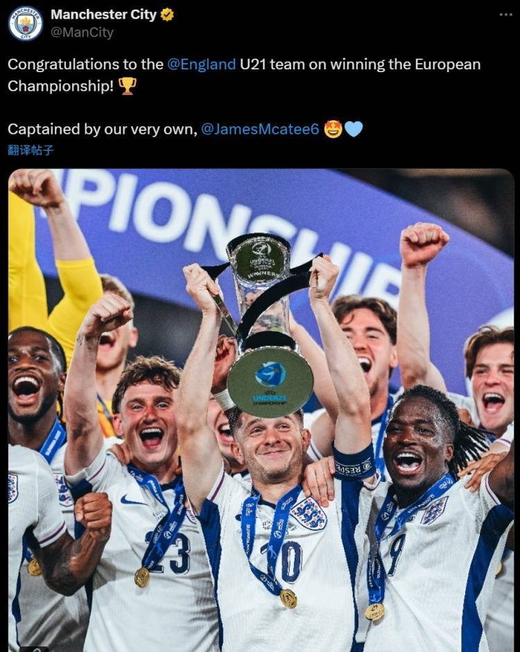 直播吧6月29日讯 英格兰U21在本届欧青赛决赛加时3-2击败德国,成功卫冕。曼城小将麦卡蒂当选决赛MVP并作为队长捧起奖杯,曼城官方也晒照送上祝贺:“祝贺英格兰U21夺得欧青赛冠军,他们的队长正是我们的麦卡蒂!”22岁的麦卡蒂主要司职前腰和中前卫,本赛季为曼城22场打进7球,当前德转身价2000万欧元。